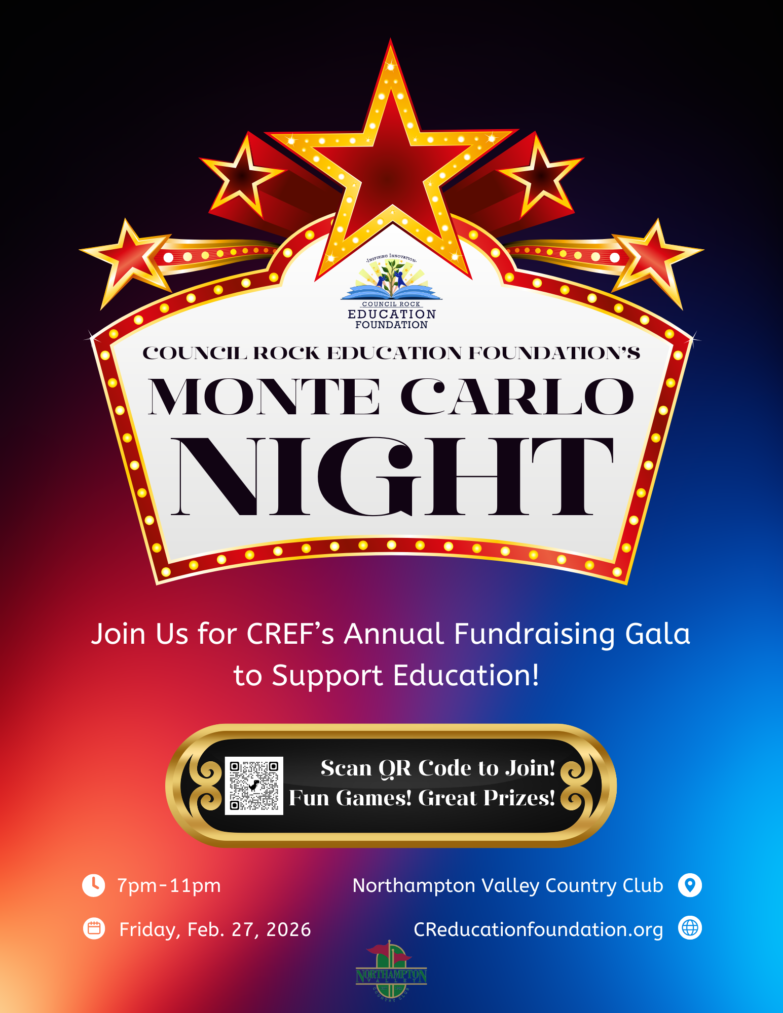 Save the date for CREF’s annual community fundraising gala! Join us on February 28, 2025, for an evening of luck at our very own Monte Carlo Night, where the excitement of casino-style games meets the spirit of the community. This fun-filled philanthropic event is a celebration of public education while uniting local businesses, community organizations, and Council Rock families and staff. Together, we'll raise funds to enhance and elevate educational opportunities for our students. Mark your calendars for an unforgettable night of fun, games, and community pride. Be ready to roll the dice on February 28, 2025, for a great cause.